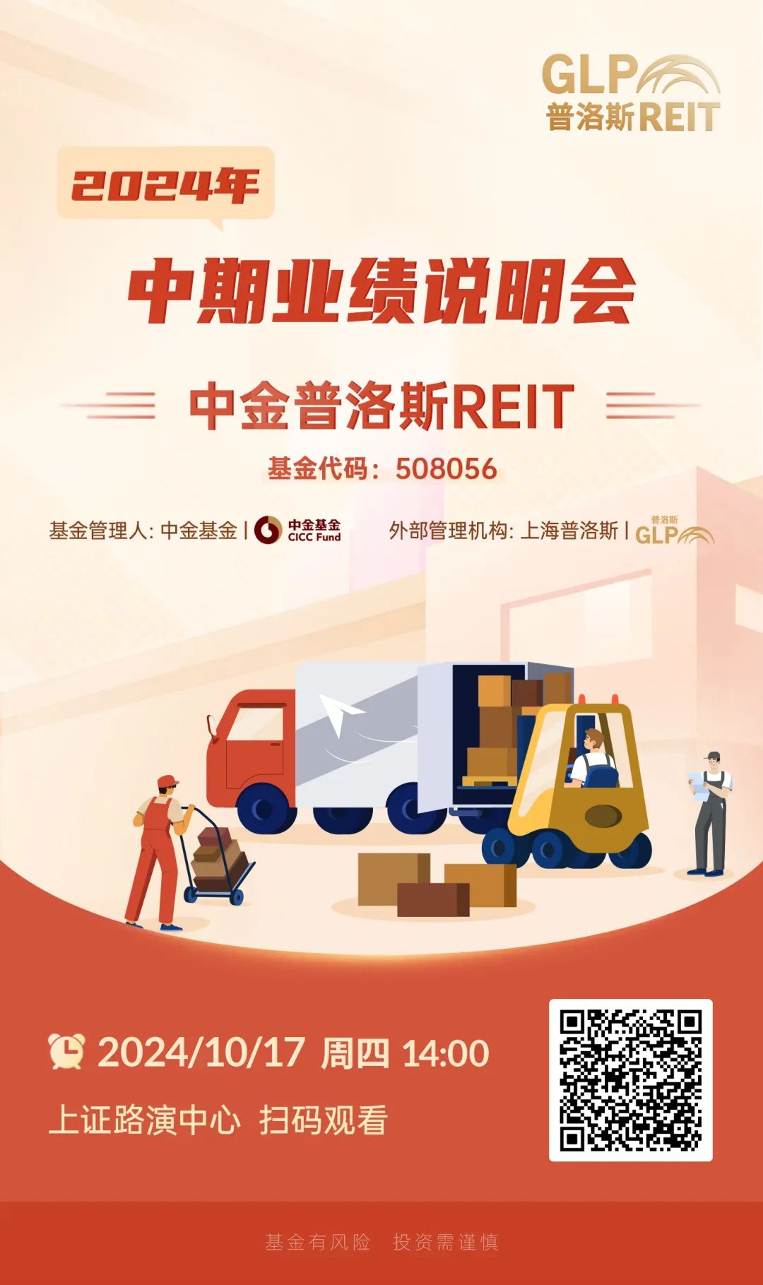 中金普洛斯REIT将于10月17日(星期四)召开2024年中期业绩说明会,以便广大投资者更全面深入地了解中金普洛斯REIT过去半年的经营成果及财务状况。
